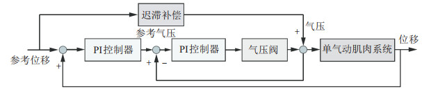 在传统PID、PI控制方法的基础上, 为了进一步提高控制精度, 学者们提出了一种带有前馈迟滞补偿的级联位置控制策略.该策略内环基于气动人工肌肉内部的气压反馈, 用来处理其内部气压的非线性特性; 外环基于气动人工肌肉的位置反馈, 用来处理其动力学本身的非线性特性.例如, Minh等[49]针对一种单气动人工肌肉-负载系统, 首先利用Maxwell-slip模型对气动人工肌肉的气压位移迟滞特性进行建模和前馈补偿, 然后采用级联控制结构(如图 4所示), 内环和外环均采用传统的PI控制器分别进行气压控制和定位跟踪控制.