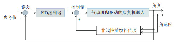 早在2006年, Vanderborght等[42]便使用12根气动人工肌肉组装实现了一种双足步行机器人, 基于气动肌肉的理论模型(1)设计了经典的bang-bang控制器, 驱动机器人关节跟踪给定轨迹.经历初步尝试, 气动人工肌肉驱动的柔性机器人克服了传统刚性机器人在柔顺性方面的本质局限, 安全性更高, 促使众多学者纷纷将其应用在医疗康复领域.具体而言, Chen等[69]设计并实现了一种安全可靠、具有可控冲击响应的软机器人, 其整体由气动人工肌肉驱动, 所用气动肌肉的模型为动态特性模型(3), 控制系统采用PD控制方法实现机器人关节的轨迹跟踪.类似地, 文献[70]针对气动人工肌肉驱动的康复机器人设备, 在气动肌肉现象模型(2)的基础上, 使得拮抗肌肉对中的气压增量保持一致, 计算出多根肌肉合力的扭矩后, 结合PID反馈控制器以及前馈补偿方法(如图 5所示), 实现了良好的跟踪控制效果.为了辅助患者手部康复训练, Das等[71]设计了一种由4根气动人工肌肉驱动的可穿戴力反馈手套, 该文献采用简单的比例控制器, 即可支持手腕与前臂的屈伸、伸展、内旋及反掌运动.