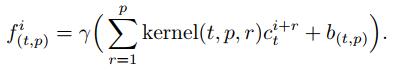 其中: kernel(t, p, r)为t时刻卷积层第p个卷积核的第r个值; b(t, p)为偏置项; cti+r为