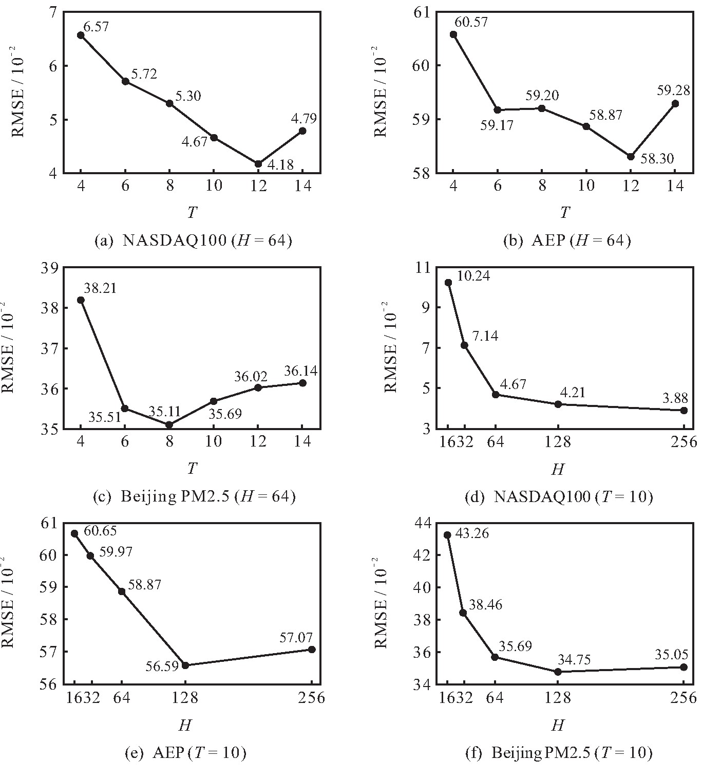 由图 2可知, 对于NASDAQ100数据集, 当T=12, H=256时模型性能最佳; 对于AEP数据集, 当T=12, H=128时模型性能最佳; 对于Beijing PM2.5数据集, 当T=8, H=128时模型性能最佳.
