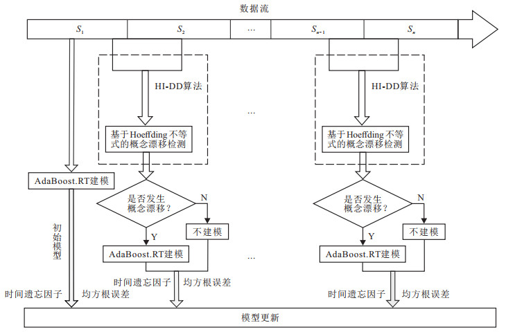 2.2 AdaBoost.RT与HI-DD结合的SOH预测算法基于上述所提出的HI-DD算法, 使用滑动窗口策略进行数据的实时分块, 并对所分相邻数据块之间进行概念漂移的实时检测, 如果检测到发生概念漂移, 则说明该SOH的数据模式发生了变化, 需要对检测到的数据块进行建模并更新总模型, 如果没有检测到概念漂移的发生, 则保留原模型无需进行更新. 另外, 针对单一的数据驱动算法预测精度低且容易出现过拟合的问题, 本文采用集成学习算法对数据块进行建模预测. 集成学习具有强大的学习能力并且有很高的精确度, 其通过集成策略将多个子学习机融合, 达到提高学习性能及预测精度的目的. AdaBoost是集成学习中的主要分支之一, Solomatine等[10]提出的AdaBoost.RT算法在回归问题的应用具有较好的性能, 具有强大的学习能力, 所以选取AdaBoost.RT算法对检测到的数据块进行建模并预测SOH. 在模型更新过程中考虑到历史数据和实时数据对现有模型的重要程度不同, 引入时间遗忘因子并结合模型的误差率共同指导模型的更新, 因此根据上述描述, 该算法的基本原理如图 3所示.