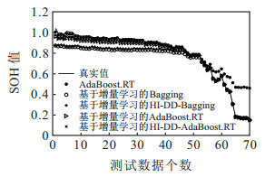 3.2 基于增量学习的HI-DD-AdaBoost.RT算法的在线SOH预测在所选取电池实验数据的基础上, 本文所有算法实验均在Windows 10系统和Matlab R2016b环境下运行, PC机硬件配置为: Intel(R) Core(TM) i7-6 700 CPU, 32 GB内存, 500 GB硬盘. 选取第1节的9个评价指标作为模型的输入, 最大可用容量定义的SOH作为模型的输出, 采用基于增量学习的HI-DD-AdaBoost.RT算法进行在线预测.