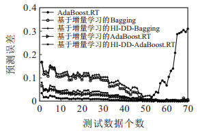 根据上面检测到的发生概念漂移的点, 分别应用AdaBoost.RT集成算法、基于增量学习的Bagging算法、基于增量学习的HI-DD-Bagging算法、基于增量学习的AdaBoost.RT算法、基于增量学习的HI-DD-AdaBoost.RT算法进行SOH的预测, 其预测的最终结果和预测误差如图 7和图 8所示.