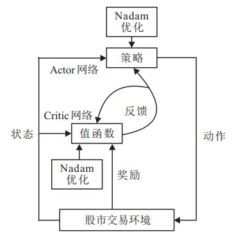 图 1给出了强化学习网络通用的强化学习框架Actor-Critic, 通过与股价市场历史数据进行动态交互, Critic网络产生值函数信息以判定策略更新后的优势, Actor网络在Critic网络给定的优势信息作用下, 动态调整策略更新的范围, 从而最小化目标函数值.