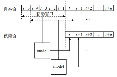图 2是使用预测模型预测股价的方法结构图. 从股价短期预测的角度看, 股价的5日均线对短期的股价具有较强的敏感性, 能够及时地反映股价在短期的资金动向, 并且非节假日时期股票可交易周期为5天[18]. 因此, 在模型训练及测试过程中, 使用前5天的股价数据矩阵预测下一天的股票收盘价, 上述数据矩阵以历史股票数据的开盘价、收盘价、最高价、最低价和成交量作为数据列标签内容, 数据矩阵大小为5×5. 将数据矩阵作为预测模型的输入矩阵, 并以大小为5的移动窗口依次选取输入矩阵的数据, 通过预测模型得到预测值.