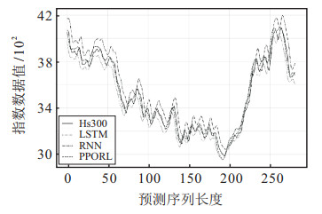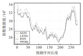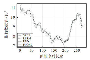 由表 3可知, PPORL预测方法在3支指数集上的4个评价指标均优于RNN和LSTM网络. 在SZZS指数集上, PPORL预测方法的RMSE较RNN网络和LSTM网络分别降低52.56和10.76, MAPE较RNN网络和LSTM网络分别降低1.69 %和0.30 %. 在SZCZ指数集上, PPORL预测方法的RMSE较RNN网络和LSTM网络分别降低75.21和103.89, MAPE较RNN和LSTM分别降低0.77 %和0.98 %. 在HS300指数集上, PPORL预测方法的RMSE较RNN网络和LSTM网络分别降低49.92和30.46, MAPE较RNN和LSTM分别降低1.29 %和0.56 %. 由此可知, PPORL在3支指数集上均表现出了较好的拟合效果.