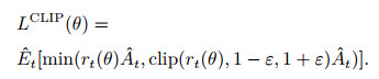 上述目标函数LCLIP(θ)中共包含两部分内容: 第1部分为未截断的策略概率比; 第2部分为在区间[1-ε, 1+ε]进行截断后的概率比. 最终得到未截断目标和截断目标中的最小值.