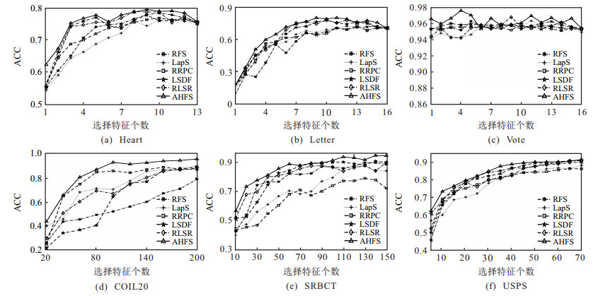 本节将AHFS与流行的半监督特征算法相比较, 并分析算法选择特征的性能.