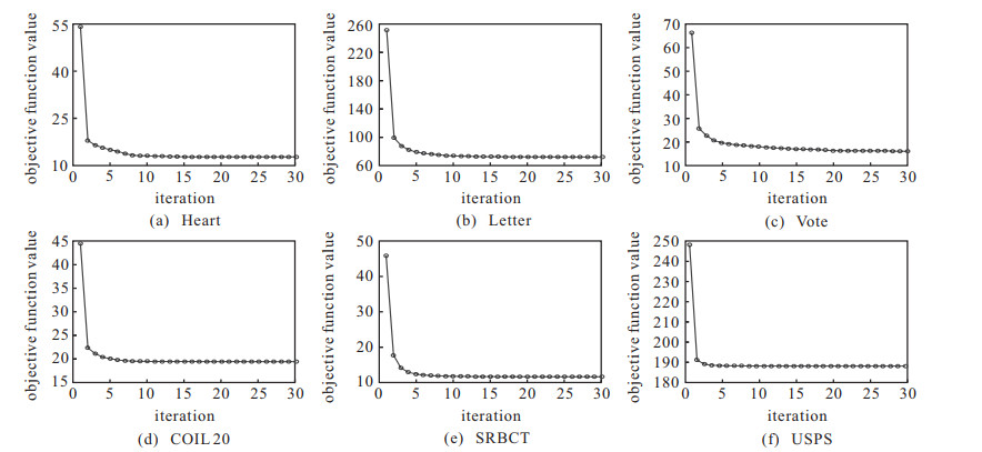 3.6 收敛性分析本文提出了一种有效递归迭代算法求解目标函数的最优解, 通过实验分析AHFS的收敛速度.在所有数据集上, 设置平衡参数