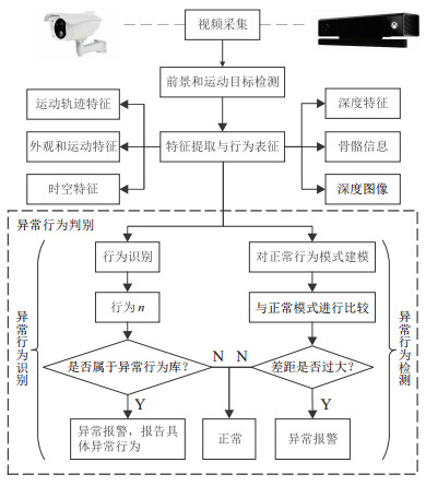异常行为的识别与检测均需进行特征提取, 而不同应用场景对特征提取方法需求不同, 进而关系到后续异常行为识别和检测方法的选取. 基于此, 本文在给出人体异常行为定义的基础上, 首先对特征提取方法进行整理和总结; 之后, 从异常行为识别和检测两个角度对异常行为判别方法进行阐述; 最后, 列举异常行为检测常用数据集及部分算法相关表现. 文末对本领域未来研究方向提出了展望.