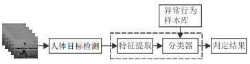 3.1 异常行为识别方法在某些特定目标和特定场景下, 正常状态与异常状态的差别较小, 因此在实际应用中, 需要对异常行为和姿态进行划分, 并建立异常行为样本库, 利用动作识别方法识别具体行为, 即提前对感兴趣的事件或行为进行定义, 结合标签对网络进行训练, 通过识别目标的具体动作和姿态, 判断其行为是否异常. 此种方法与场景具有相关性, 有助于了解具体发生了何种异常行为, 以及是否出现虚假报警[79]. 同时, 当目标人数较少或对特定人员进行行为检测时, 将此类动作识别方法与目标跟踪算法结合, 在判断目标是否出现异常行为方面能够取得较好的效果. 如图 2所示, 给出了异常行为识别的基本框架, 一般来说, 在检测人体目标后, 需进行特征提取和行为分类, 最终判别结果. 在智能家居、医疗监护等应用领域, 实现异常行为的具体识别对后续所需采取的应对策略具有十分重要的指导意义.