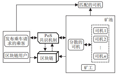 1 PoS共识机制的纳什谈判博弈模型 1.1 问题描述在一个基于PoS共识机制的共享汽车区块链网络中, 以“滴滴”为代表的网约车运营模式为例, 司机将身份、位置、价格、评价等数据添加到带有个人法定身份信息的特定文件夹上, 然后上传至区块链, 并将司机作为网络中的节点, 部署在该区块链网络中.乘客在该网络中上传需求信息, 包括起始地、目的地、服务类型等.区块链从海量信息中筛选出匹配度最高的司机, 并完成司机与乘客之间的交易.此网络一般包括4个实体:区块链用户、矿池、矿工以及验证者.在该网络下有一个矿池, 矿池内包含矿工和验证者, 发布交易请求的乘客作为区块链用户, 司机作为矿工和验证者, 如图 1所示, 所有矿工以及使用区块链客户端的移动设备都可以作为验证者[29].
