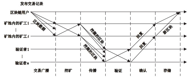 PoS共识机制的挖矿验证流程如图 2所示.区块链用户向网络广播新的交易; 矿池内的每个矿工再根据自身能力以及网络环境[29]参与挖矿竞争, 挖出包含该交易数据的区块; 矿池招募验证者, 对区块进行传播并验证其有效性; 验证通过且达成共识的区块被添加到区块链上, 矿池获得固定数量的挖矿奖励, 以及区块链用户提供的交易费用[18].