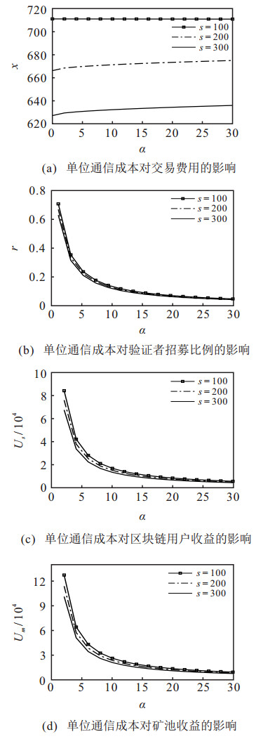 图 3(a)反映了单位通信成本对区块链用户提供的交易费用的影响.由图 3(a)可知, 交易费用随着单位通信成本的增加而增加, 这说明了矿工与验证者间的单位通信成本越大, 矿池招募验证者的动力越小, 此时区块链用户为激励矿池招募更多的验证者进行共识传播, 会提高交易费用.另外, 观察到矿工挖出的区块越大, 区块链用户提供的交易费用越小, 这是因为更大的区块会造成更长的区块传播时间, 导致区块链用户付出更多的时间成本, 为减少总成本, 区块链用户会采取降低交易费用的措施.