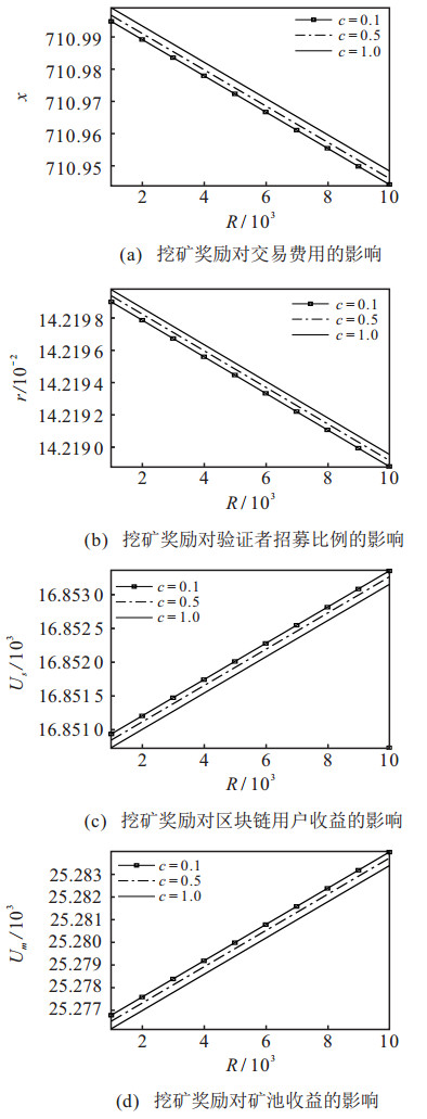 图 4(a)展示了挖矿奖励对区块链用户提供的交易费用的影响.由图 4(a)可知, 随着挖矿奖励的增加, 区块链提供的交易费用减少, 这说明当矿池的挖矿奖励增加时, 会有越来越多的矿工和验证者参与网络, 此时区块链用户会减少交易费用, 使不必要的验证者离开该网络.此外, 观察到更大的挖矿成本反而提高了区块链用户的交易费用, 这是因为当挖矿成本增大时, 矿工参与网络的积极性降低, 区块链用户为了激励更多的验证者参与, 反而提高交易费用.