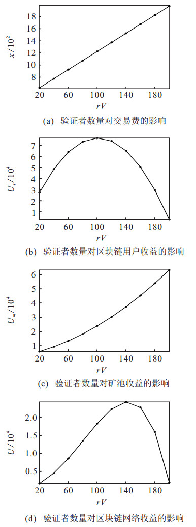 图 5(a)说明了验证者数量对区块链用户提供的交易费用的影响, 可以看出, 交易费用随着验证者数量的增加而增加, 这意味着当验证者数量增加时, 区块链用户可以从验证者数量带来的网络规模效益中获得更多的收益, 因此区块链用户仍然会提高交易费用, 激励更多的验证者参与区块的传播验证.