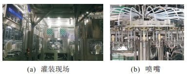 图 1 高速无菌饮料灌装现场和喷嘴 |