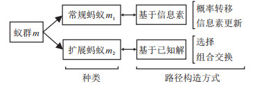 3.1 扩展蚂蚁在传统蚁群算法中, 所有蚂蚁个体遵循相同的搜索规则, 构造路径时依赖于信息素浓度. 本文在传统蚁群的基础上, 除信息素搜索的常规蚂蚁外, 另外引入扩展蚂蚁. 如图 1所示, 假设种群共有m只蚂蚁个体, 其中常规蚂蚁数量为