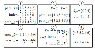 选择完成后, 每只扩展蚂蚁在除自身外其余扩展蚂蚁中随机挑选对象进行组合, 组合交换方法的设计参考遗传算法中的两点交叉算子. 在遗传算法中, 交叉算子得到的新个体差异性更强, 可以产生的大量新个体使得算法具有较强的全局搜索能力[32].因此组合交换有利于跳出局部极值, 保证全局寻优能力. 需注意路径在组合时节点首尾相连且不允许重复. 例如当第k只蚂蚁随机选中另一只个体g执行路径组合操作时, 具体步骤如下: