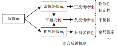 将刺激-响应分工机制与蚁群算法结合, 利用负反馈分工特性对蚁群算法的单一正反馈搜索方式进行平衡, 提出具有混合反馈机制的扩展蚁群算法.