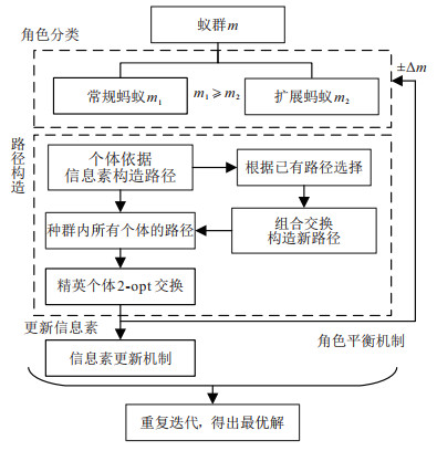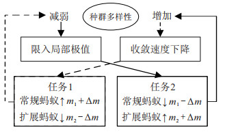如图 3所示: 常规蚂蚁参照信息素浓度构造个体路径, 具有正反馈特性, 保证算法有效收敛以及稳定性; 扩展蚂蚁通过已有路径构造新路径, 具有较强的全局搜索能力, 保证种群多样性. 角色平衡机制则用于动态调整蚁群中常规蚂蚁和扩展蚂蚁的数量占比, 平衡算法的收敛能力和全局搜索能力. 该机制基于刺激-响应分工模型设计, 本质上是一种任务负反馈模式下的调节方法.