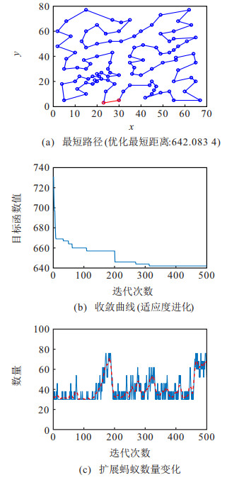 图 6为MF-ACO算法运行在eil101上得到的运行结果. 其中: 图 6(a)为最短线路、图 6(b)为收敛曲线、图 6(c)为扩展蚂蚁数量变化曲线.
