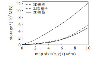 首先, 针对不同尺寸的环境分别进行2D、2.5D和3D栅格建图以比较不同建图方式下的存储空间大小, 如图 9所示. 其中: 2D和3D栅格地图的分辨率都为0.1 m
