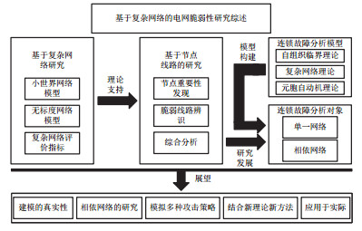 本文针对复杂网络在电力网络中的应用情况, 首先, 介绍其基本模型拓扑结构和常见的几种复杂网络评价指标; 其次, 指出目前电网网络拓扑脆弱性研究主要集中在节点重要性发现和脆弱线路辨识, 并阐述自组织临界性理论、复杂网络理论和元胞自动机理论及其模型; 再次, 就现阶段基于复杂网络的电网脆弱性研究基本可以总结为两个对象: 电网之间连锁故障分析和相依网络连锁故障分析; 最后, 探讨电网脆弱性研究的进一步发展趋势. 全文内容及其关系如图 1所示.