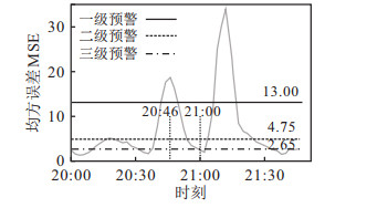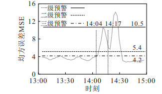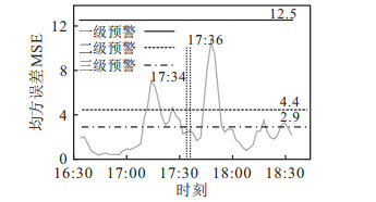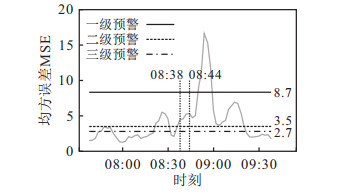 2.3 模型结果验证利用前文提到的Seq2Seq自编解码网络, 对延安高架各路段、各时刻可能发生的事故进行实时预警和检测. 为验证异常检测模型的有效性, 将原数据两周内所有两/多车事故发生前后1个小时的样本数据代入训练好的模型进行测试. 图 5~图 8为不同时段发生交通事故的预警和检测结果曲线.