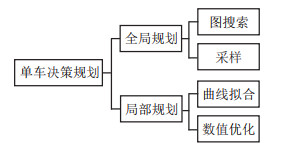 智能驾驶系统中的3个模块密切耦合协同以实现自主无人的驾驶.其中, 决策层起到连接感知模块和控制模块的关键作用, 是从感知智能和认知智能向决策智能的递进.目前, 围绕单车智能驾驶决策已经有了大量的研究[2-4].如图 2所示, 传统的单车决策规划算法可以分为4类: 基于图搜索的方法、基于采样的方法、曲线拟合方法、数值优化方法.Dijkstra算法和A*算法是常用的基于图搜索的算法.荷兰科学家Dijkstra在20世纪60年代提出了用来寻求节点之间的最短路径的经典算法, 后被称为Dijkstra算法.20世纪70年代, 斯坦福大学研究者提出了A*算法, 该算法是一种启发式的图搜索算法, 能实现节点间路径的快速搜索, 可以视为Dijkstra算法的拓展.在将车辆运动空间栅格化后, 基于图搜索的算法可以被用于车辆的路径规划.为解决复杂交通场景下的车辆决策规划问题, 研究人员还提出了改进的Dijkstra算法[5-6]和A*算法[7-8].快速拓展随机树(RRT)算法是一种基于采样的方法, 它由美国科学家LaValle于1998年提出, 并得到了广泛的发展与应用[9-11].但该算法对整个空间进行均匀采样, 无法保证规划的效率.曲线拟合方法和数值优化方法是局部路径规划算法, 其中常用的算法有多项式曲线法[12]、贝塞尔曲线法[13]和直接优化法[14-17].