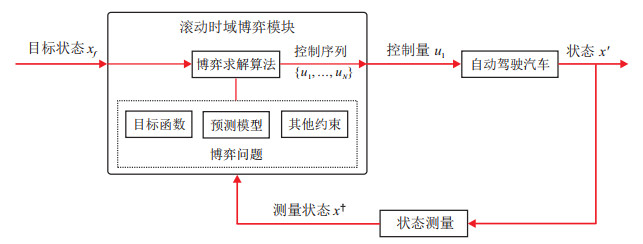 1.1.3 滚动时域博弈重复博弈在使用相同的静态博弈模型前提下具备了动态决策能力, 能够产生决策序列以处理需要连续动态决策的问题.在智能驾驶决策场景中, 博弈模型在各个阶段保持不变是不现实的假设.更为合理的设想是驾驶行动集合不变, 但是, 可以根据当前的交通状态在每个阶段更新博弈收益.将重复博弈与模型预测控制的思想结合, 就形成了滚动时域博弈.此时既保持了重复博弈的形式又引入了状态预测, 但决策依然是一个从历史到当前行动的映射.图 3展示了滚动时域博弈的流程, 其中目标状态