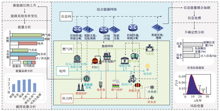 2011年, 世界能源委员会(WEC)提出能源领域“不可能三角”问题[1], 即能源系统的环保、安全和经济三者不可同时兼顾, 此后对不可能三角问题特性的研究成为提升系统效率、缓解能源危机的重要手段. 2020年以来, “碳达峰、碳中和”成为能源系统的重要目标, 系统中新能源比例进一步提升[2-3]. 总体而言, 相比于传统能源系统, 纳入高比例可再生能源后综合能源系统中源侧的碳排放降低, 整体不确定性上升, 可观可控性下降, 系统需要配置额外备用容量实现能量平衡; 同时, 信息系统与能源系统耦合加剧, 实时获取网络及节点的状态信息, 实现源网荷储一体化控制, 使系统能控性上升[4-6], 信息处理在系统中的影响愈加重要. 综合能源系统的结构演化及其衍生出的新问题如图 1所示.