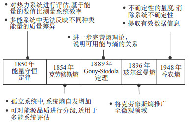 本文其余部分组织如下. 第1节介绍熵的基础理论发展及其应用, 并对熵理论量化不可能三角特性的优势进行说明, 为破解不可能三角问题提出一种新的思路. 第2节介绍基于熵理论的系统环保性分析, 并基于玻尔兹曼熵的定义从能量品质评估与碳流分析两个方面, 分析熵理论在综合能源系统中度量能量质量、评估系统效率、计算碳流排放等方面的应用, 从而实现对综合能源系统的环保特性影响. 第3节介绍基于熵理论的系统安全性分析, 并基于信息熵定义进行不确定性的度量评估, 介绍信息熵在综合能源系统中提升模型精度、建立评估指标、消除系统不确定性等方面的应用, 从而实现对综合能源系统的安全特性影响. 第4节介绍基于熵理论的系统经济性分析, 分别介绍传统能量网络中考虑玻尔兹曼熵与经济成本的多目标优化方法与综合考虑多重影响因素的模糊决策方法, 并介绍基于信息熵的信息价值评估, 从而实现对综合能源系统的经济特性影响. 第5节对熵理论在综合能源系统不可能三角研究的未来应用进行展望.