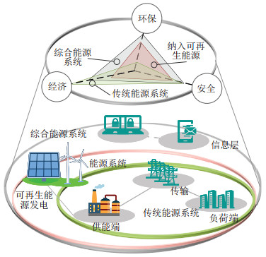 在综合能源系统中, 如何处理不同种类能源相互耦合问题并实现能源的高效利用, 与如何分析可再生能源的影响并建立清洁低碳系统是环保性分析需要面对的两个基础问题.