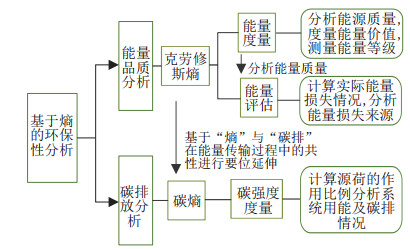 2 基于熵理论的系统环保性分析传统改善系统环保性的方法以提高系统能效为主, 基于熵的能量评估可以度量系统中可用能的变化. 该方法可以处理不同种类能源的相互耦合问题, 实现能源的梯级利用, 广泛用于多能系统. 在综合能源系统中, 除传统提升能效的方法外, 还可改变系统用能决策以降低系统中碳排放, 实现能源的清洁. 本节主要研究内容如图 4所示.