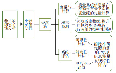 3 基于熵理论的系统安全性分析综合能源系统的源侧由确定性一次能源保障供能转为波动性的可再生能源, 带来系统安全的新问题. 本节基于熵的不确定性评估, 度量信息中的不确定性. 在传统数据预测模型与传统能源网络可靠性、灵敏性、稳定性分析的基础上, 根据熵理论提取数据中的有效信息, 处理不确定背景下复杂性急剧上升的综合能源系统问题. 本节主要研究内容如图 5所示.