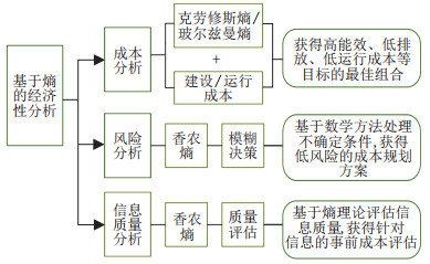 4 基于熵理论的系统经济性分析能源网络经济性分析中, 往往以系统成本作为唯一评估目标. 而对能源不可能三角问题的研究表明, 虽然无法获得三目标平衡, 但往往可以环保、安全与经济其中两角取得优化, 因此针对经济性的研究一般转化为系统优化问题. 基于环保性与安全性的分析结果结合经济成本目标对系统结构组合的实际潜力进行改进, 通过优化系统的运行, 控制能量供应、转化设备的输出, 获得高能效低排放、高可靠性、低运行成本等目标的最佳组合具有重要意义. 基于熵理论核算信息成本的研究较少, 部分研究以减少不确定性的影响分析信息价值. 本节主要内容如图 6所示.