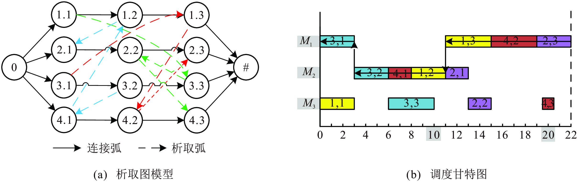 析取图模型是描述JSP并对其进行理论分析的有力工具, JSP的析取图模型定义为$G=\left\langle N, A, E \right\rangle$. 其中: $N $为所有工件的工序节点以及2个虚拟节点(开始节点和结束节点, 分别用0和$\# $表示)组成的集合; $A $为同一工件相邻两道工序间的连接弧集合, 对应于工件的工艺路线约束; $E $为同一机器两道工序间的析取弧集合, 对应工件的机器路线约束. 图$G $中, 路径$P=\{o_1, o_2, \ldots, o_n \} $表示从节点$o_1 $到$o_n $的一条有向通路, 由一系列相邻节点间的有向弧$(o_i,o_{i+1}) $ ($1 \leqslant i < n$)组成, $L(u,v) $表示$G $中从工序$u $的节点到工序$v $的节点最长路径的长度, 从开始节点到结束节点的最长路径称为关键路径, 对应调度的最大完工时间$ {{C}}_{{\max}}{=}{L}{(0}{,}{\#)} $.