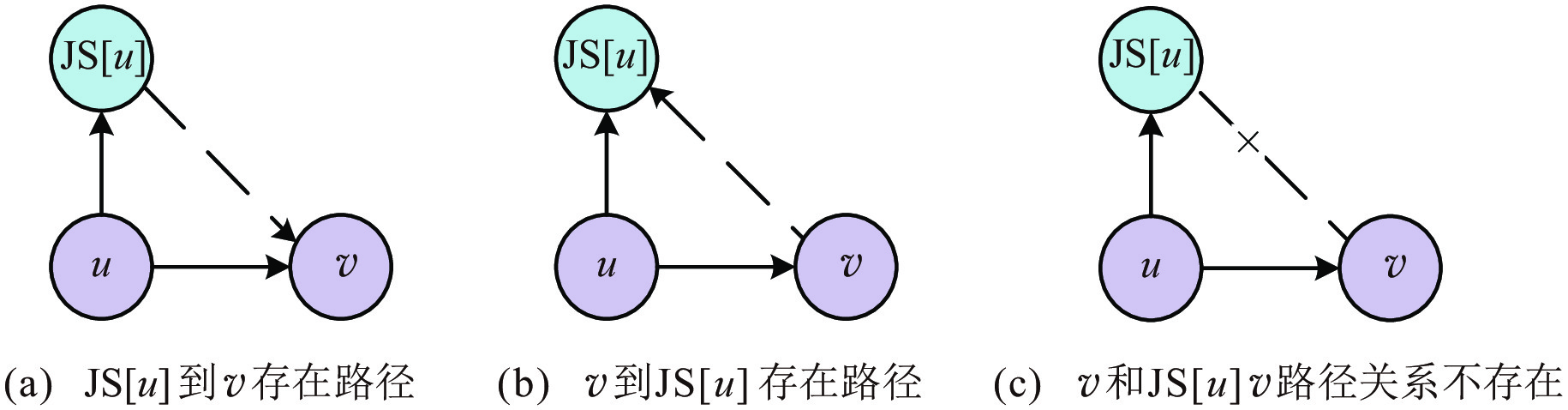 定理2 给定一个DAG图$G $和其拓扑排序$F_G $, 若$ {{f}}_{{G}}{(}{u}{)}{}\,{ < }\,{}{{f}}_{{G}}{(}{v}{)}{} $, 则图$G $中不存在从$v $到$u $的路径.