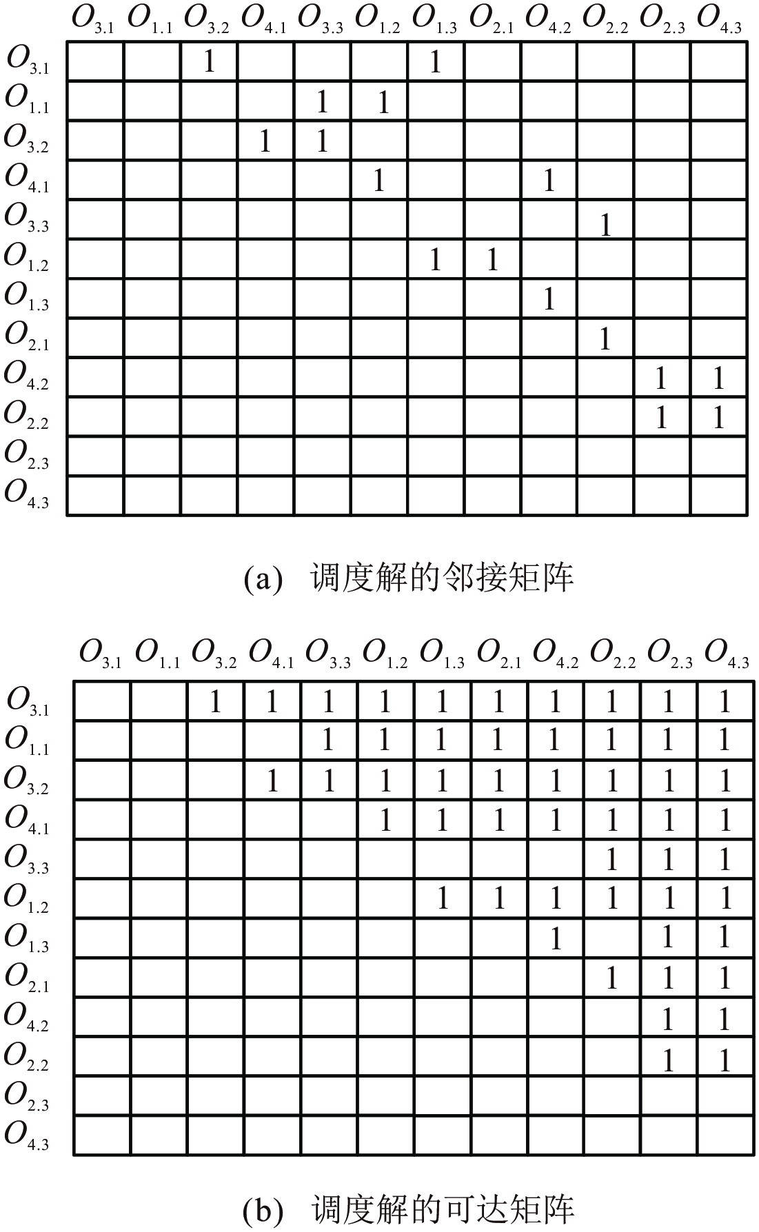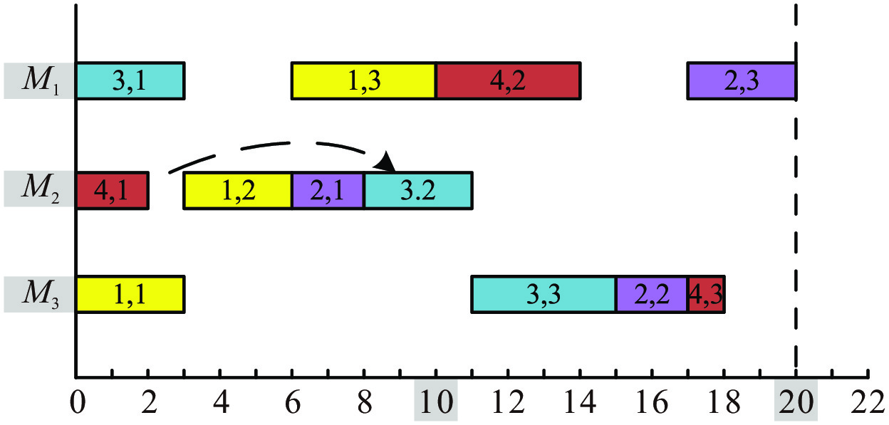 表1所示为一个4$\times $3的JSP实例, 由4个工件与3个机器共12道工序组成, 后续的邻域移动分析及方法解释均基于该实例进行说明.