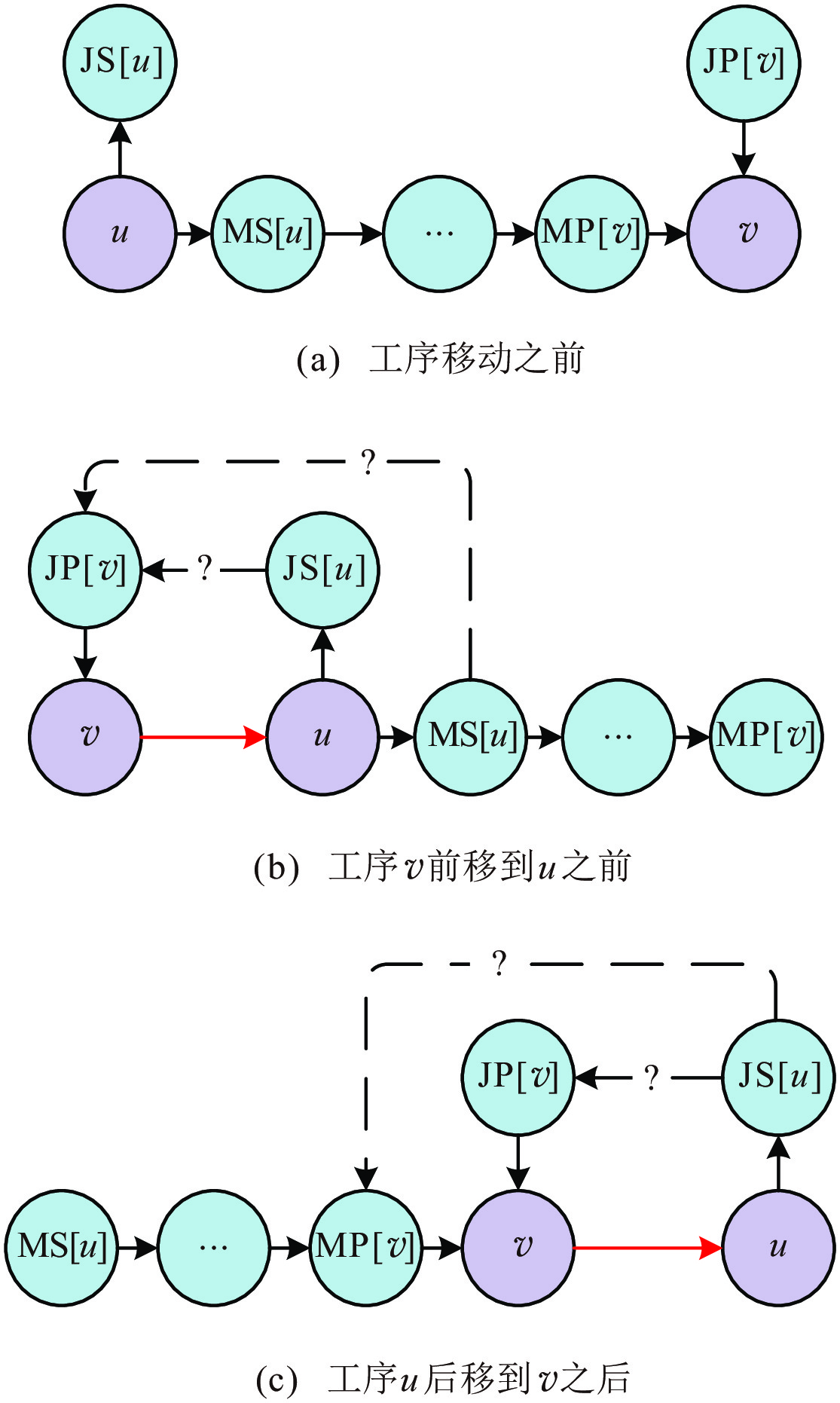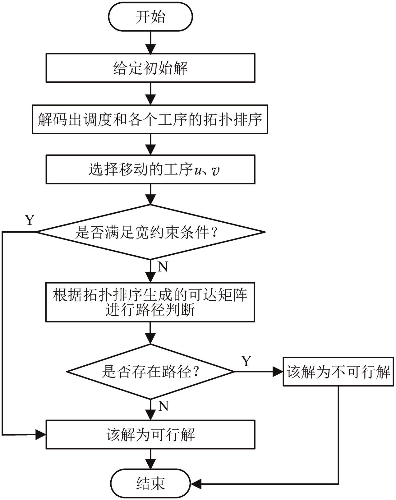 上述邻域结构都是求解JSP较为有效的方法, 但对于部分邻域移动, 它们生成的邻域解不一定都是可行解, 不可行解会增大算法的搜索范围, 导致计算时间的大幅度增加, 邻域解的可行性判定影响着算法整体求解质量和效率. 针对这一现象, 学者们各自提出了可行解的快速判断方法. Dell’Amico等[2]从工序最大完工时间角度提出了可行解判断条件, 从而保证N4邻域移动的可行性; Balas等[4]从工序头尾长的角度提出了一种判断可行解的约束条件, 后续一些学者在此基础上进行了一些拓展, 如文献[5, 7-8]等; Sun等[12]提出了一种基于图论的启发式判别算法. 但这些约束条件大多为充分不必要条件, 无法将所有的可行解包括在内, 容易遗漏一部分有潜在提升可能的解[11]. 除了基本的局部搜索算法外, 将其他智能优化算法应用于JSP已成为当前研究领域的一个热点, 如近年来新兴的近端策略优化算法[13]、多目标进化算法[14]等其他优秀算法, 它们为解决JSP及其衍生问题提供了重要方向.