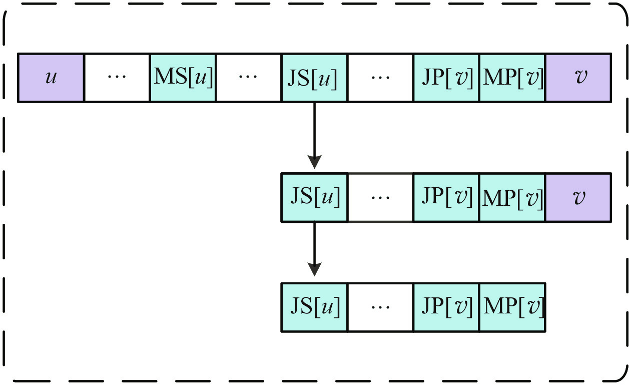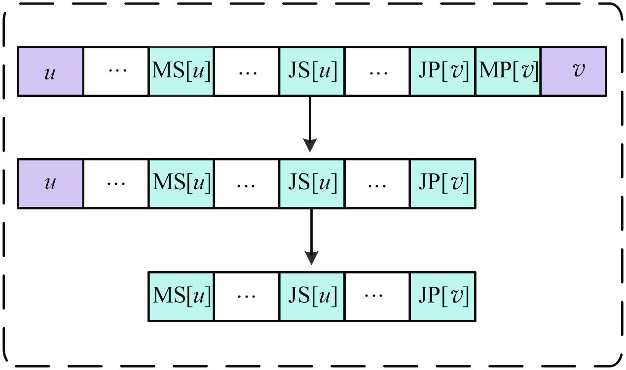 基于一定邻域结构的局部搜索算法是一种求解JSP快速有效的方法, 局部搜索算法的特点是从一个解出发, 根据一定的规则自我进化, 从而探索最优解. 邻域结构是对一个给定解产生小的扰动获得邻域解的机制, 它是局部搜索的核心, 极大影响算法的搜索效率和解的质量. JSP中较为常用的是基于关键路径的工序块邻域结构, Dell’Amico等[2]提出了块的概念以及N4邻域结构, 即在保证邻域解可行的基础上, 将块内的工序尽可能地向块首或块尾移动; 基于N4邻域结构, Nowicki等[3]提出了N5邻域结构, 将关键块的块首与块尾工序交换; Balas等[4]提出的N6邻域结构是将关键块的内部工序移动到块首和块尾; Zhang等[5]在此基础上提出的N7邻域结构考虑了将关键块的块首和块尾工序移动到块内的移动方式; 潘全科等[6]在差分进化算法中提出了一种基于块结构的插入和交换邻域结构; 赵诗奎等[7]通过分析加工机器上关键工序前后的空闲时间, 提出了一种新型邻域结构; Xie等[8]进一步扩展了N7邻域结构, 将关键块上的工序移动到关键块外, 能搜索更广阔的解空间; 薛玲玲[9]提出了一种基于块结构邻域搜索的遗传算法; 巴志勇等[10]分析了N7邻域结构关键块中工序无效移动的情况, 设计了一种3对工序精确联动的邻域结构; Gui等[11]分析了工序移动是否为可行解的充要条件, 从工序路径关系上提出新的邻域结构.